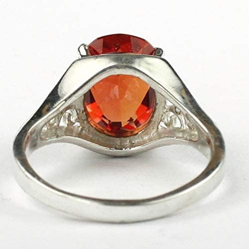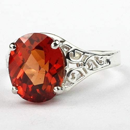 6 carat Created Padparadscha Sapphire sits in 3.4 grams of solid sterling silver filigree. A Blazing Orange Created Padparadscha Sapphire with Plenty of Fire. (Created Padparadscha simulates a bright orange sapphire originally mined in Padparadscha, India. It's virtually impossible to find the natural stone any more, and if you ever found one that looks like this one, it'd be worth about $10,000.00.) Measuring 12x10 mm, it weighs a whopping 6 carats. The ring itself is a heavy, with a good feel to it and is made of .925 Sterling Silver. The sides have a good wide filigree pattern, and enhances the stone nicely, while at the same time allowing it to stand on its own merits. It's a good, solid mounting; 3.4 grams, and very sturdy. Ring sizes 3-16 in 1/4 size increments Ring sizing is FREE! 30 day unconditional guarantee 1 year warranty on workmanship. Our jewelry is custom made when you order.