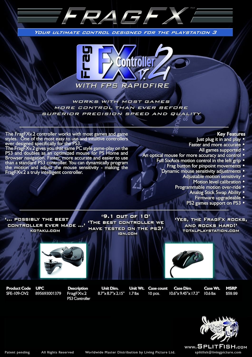 FRAGFX V.2 SE with FPS RAPIDFIRE Your Ultimate Control Designed for the PlayStation 3 Works with most games More control than ever before Superior precision speed and quality Package includes -Right Hand Optical Controller -Left Hand Grip with 10 Foot USB Cable -Manual Key Features -An Optical mouse for more accuracy and control -Faster and more accurate -Full SixAxis motion control in the left grip -Adjustable motion sensitivity -Motion level calibration -Programmable motion over-ride -Dynamic mouse sensitivity adjustments -Frag button for pinpoint movements -Analog Stick Swap Ability -Just plug it in and play -Firmware upgradeable -Most games supported -PS2 games support on PS3